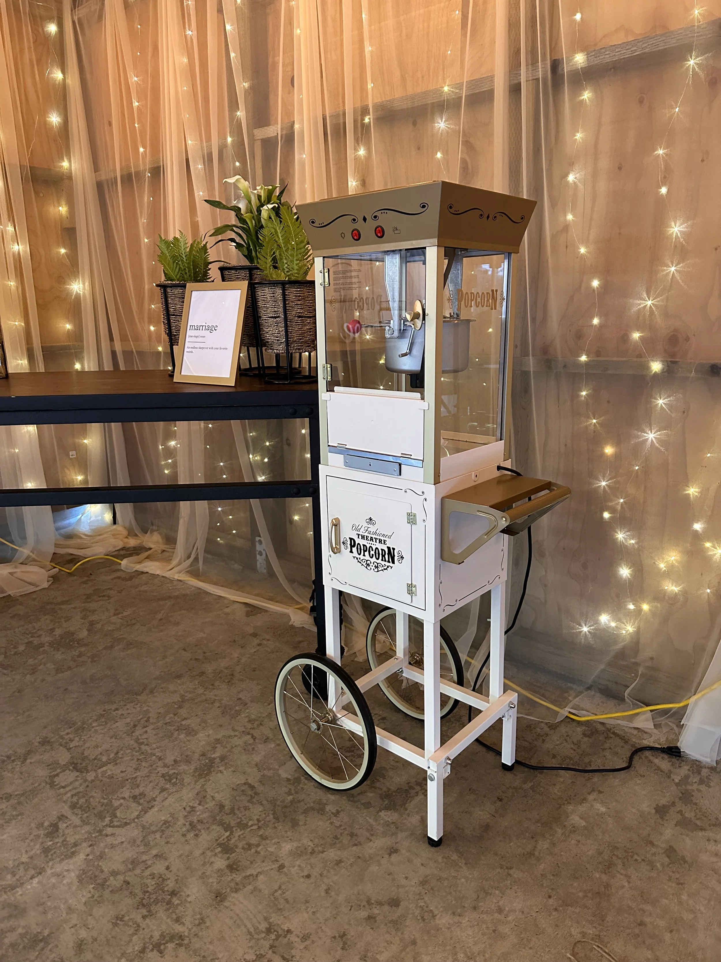 This vintage standing popcorn and candy dispensing cart is designed to enhance both indoor and outdoor gatherings with its charming vintage appearance. Elevate your movie night or outdoor gathering with this user-friendly convenient machine that promises to captivate your guests and elevate the overall event experience.